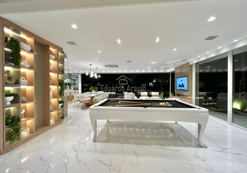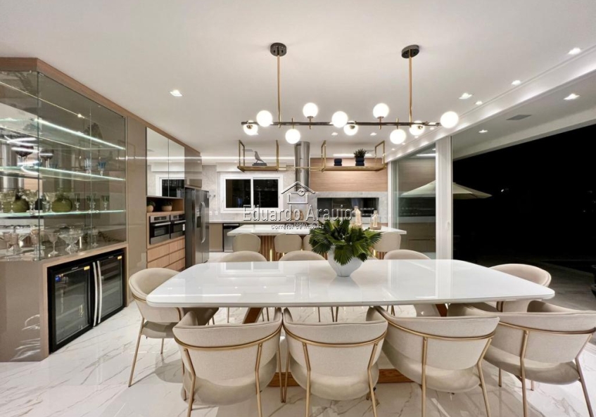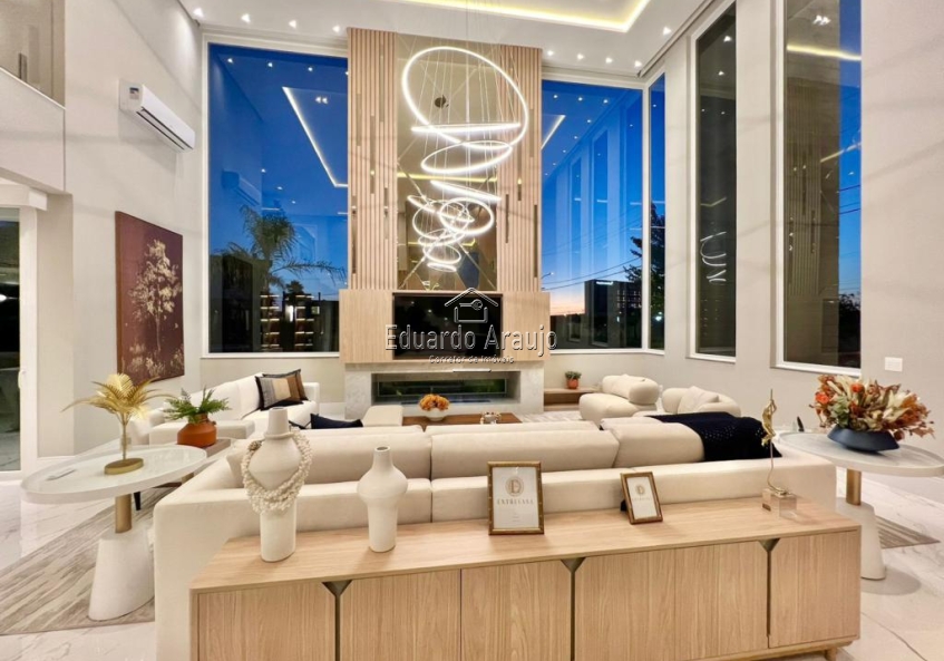 Sobrado beira lago com 5 suítes, sendo uma suíte master com closet e banheira, lavabo, ambientes integrados, lareira, churrasqueira, área de serviço, finamente decorado e mobiliado, piscina em concreto, vaga coberta para 2 carros.