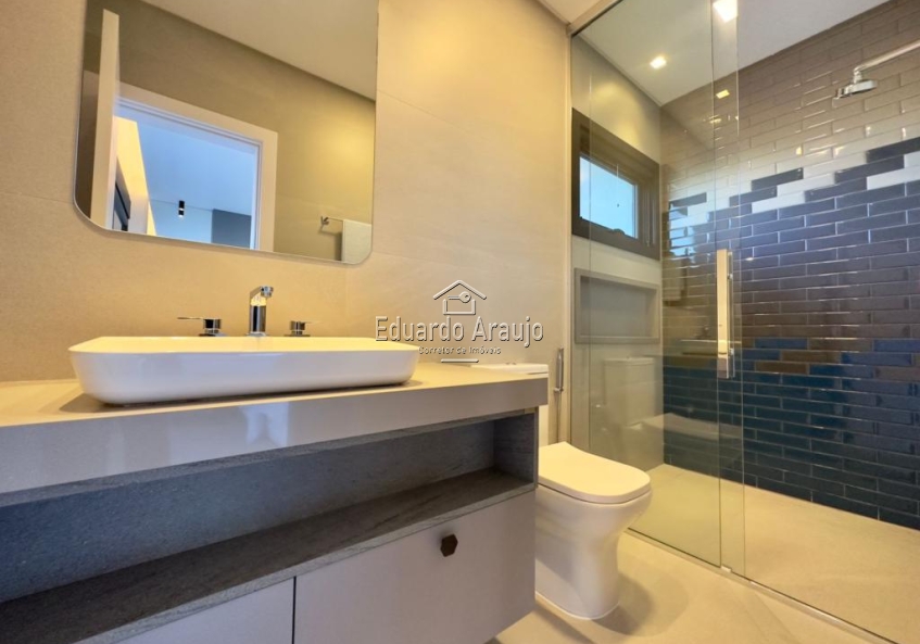 Sobrado beira lago com 5 suítes, sendo uma suíte master com banheira, lavabo, ambientes integrados, lareira, churrasqueira, mesa de sinua, área de serviço, piscina, fica mobiliado e decorado, vaga para 2 carros. Condomínio com infraestrutra completa.