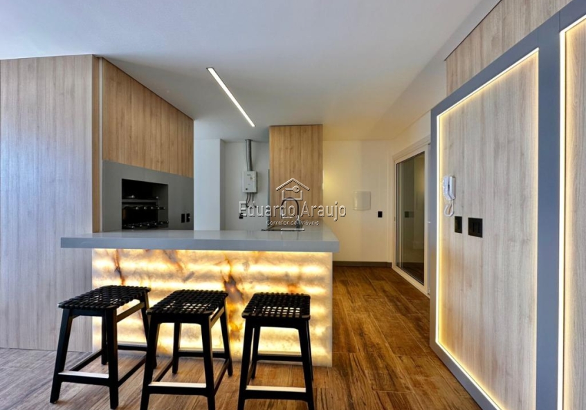 Apartamento de 3 dormitórios, sendo 1 suíte, banheiro social, lavabo, ambientes integrados, churrasqueira, área de serviço, fica mobiliado e decorado, possui split em todos os cômodos e possui 2 boxes. Edifício com infraestrutura completa.