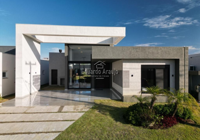 Casa térrea nova/nunca habitada com 173 M² e 4 suítes, lavabo, ambientes integrados, lareira, churrasqueira, área de serviço, piscina de concreto, paisagismo, fica mobiliada e decorada, vaga para 2 carros.