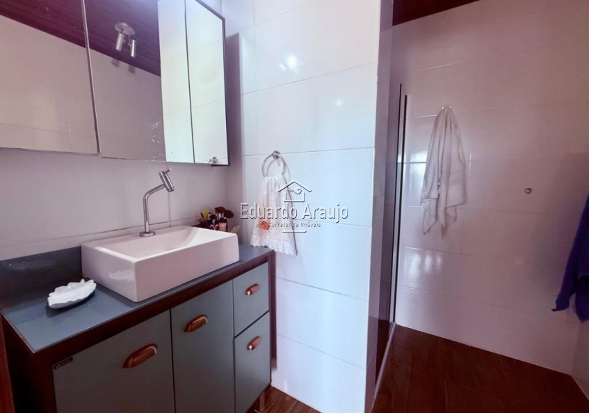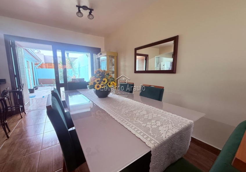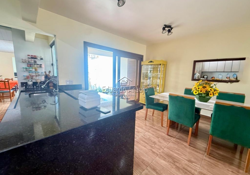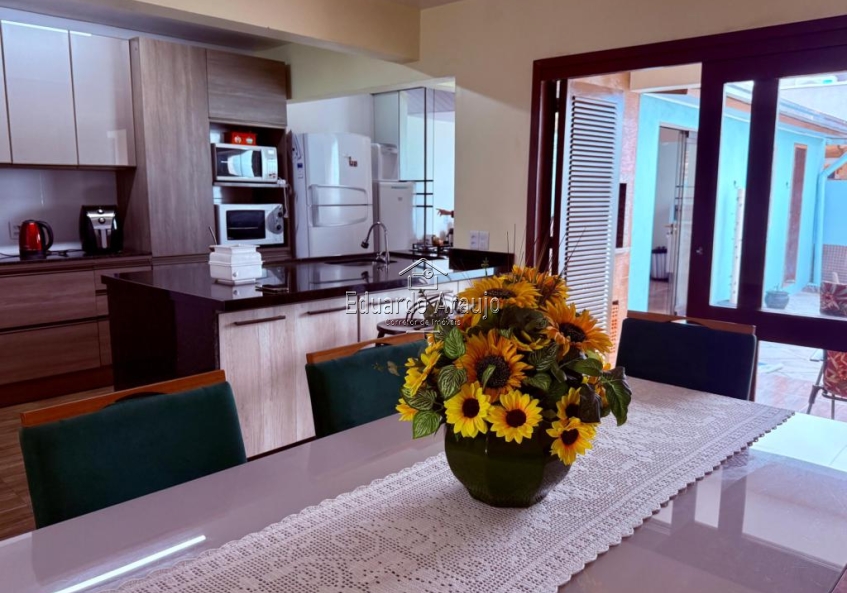 A garagem coberta e o depósito oferecem praticidade adicional. A sala de estar e a sala de jantar estão integradas, criando um ambiente acolhedor e arejado. A cozinha planejada, com ilha em granito, é um verdadeiro destaque, perfeita para quem ama cozinhar.
